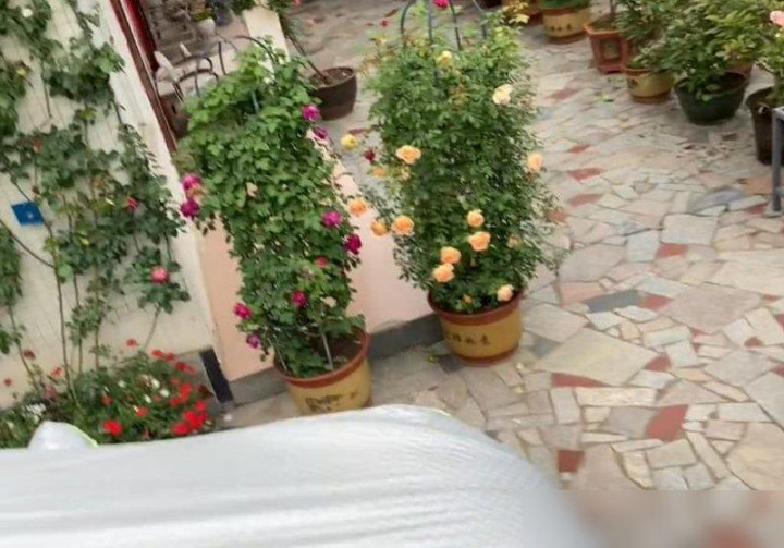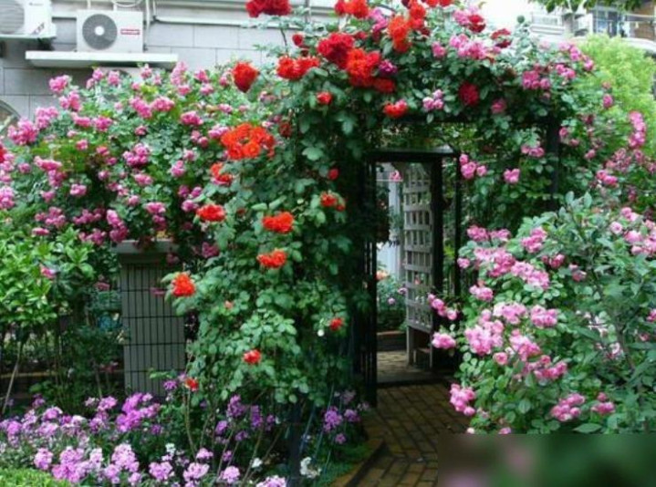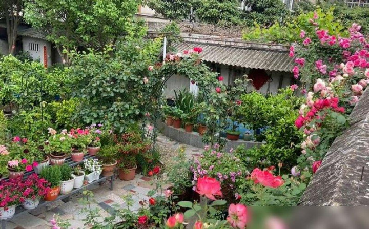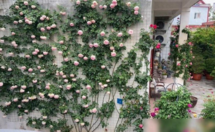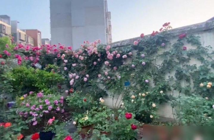 前几天刷到个视频,差点把我看哭——河南一位大叔的院子,从墙根到屋顶全爬满了花,粉龙月季顺着墙面铺成瀑布,蔷薇缠在院门上绕成拱门,连犄角旮旯的盆栽都开得热热闹闹,像把春天揉碎了装在院子里。