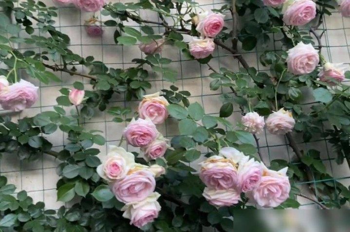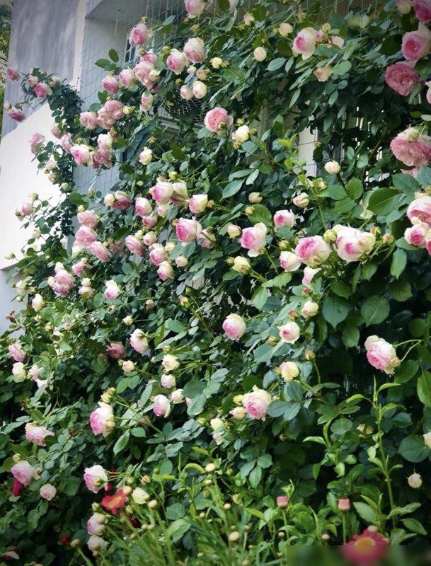 你见过把藤本月季养到“成精”的吗?大叔那面粉龙墙,花瓣一层叠着一层,像刚晒过太阳的棉花糖,风一吹就飘着淡淡的香,我隔着屏幕都能闻到那种“日子很甜”的味道。